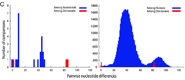 紅色是3位丹尼索瓦人兩兩間的差異(3個樣本,有3個差異),左邊藍色是7位尼安德塔人間,右邊藍色是311位智人間。
