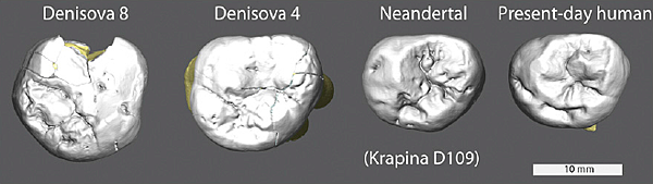 左邊是2個丹尼索瓦人的牙齒,彼此形態類似,右二是尼安德塔人,右一是現代的智人。丹尼索瓦人的牙齒明顯比智人和尼安德塔人更大。