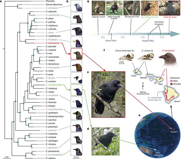 夏威夷烏鴉(Hawaiian crow,學名Corvus hawaiiensis),又叫作聽起來很可愛的「‘alalā」 ,目前在野外已經絕跡,全族只剩下人為養殖的109位個體。有科學家觀察到,夏威夷烏鴉會使用樹枝作為工具(主要是戳進樹洞或縫縫裡,可見牠們也是戳樂黨,見影片),這是鳥類中相當罕見的高段行為。