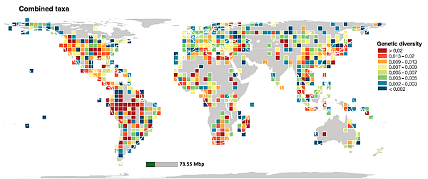 如今地球上各地,物種的分佈狀況如何,哪些地方的遺傳多樣性比較高?這個2016年的論文蒐集大筆資料,定量分析全球尺度下,陸生與兩棲動物,在各個區域的物種與種內的遺傳多樣性。