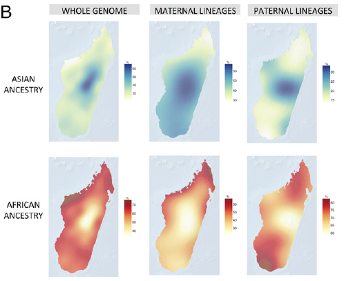 在整個基因組中,島上居民的平均祖源(ancestry),南島是36.6%、班圖是59.4%。不過以上是總平均,細看各地的話都不太一樣,大致上,南島祖源在島中央的高地區域比例較高,班圖祖源則以周圍靠海區域較多。