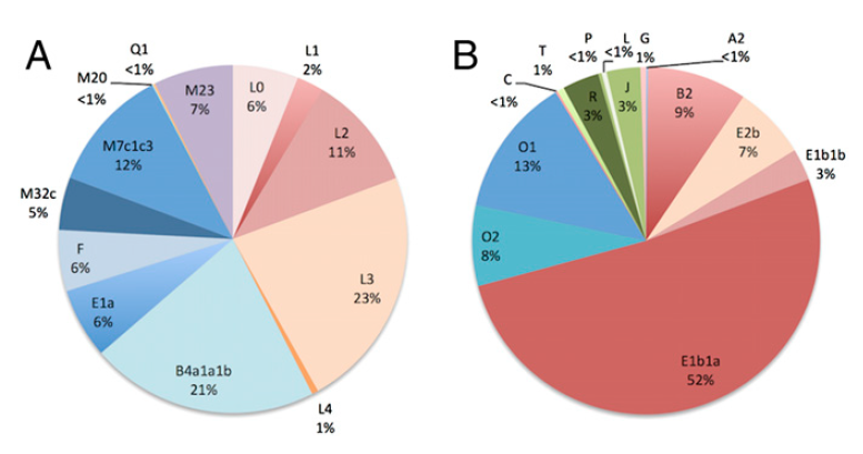 粒線體是母系遺傳,全島人的型號中,約有50.1%源自南島、42.4%來自班圖;父系遺傳的Y染色體型號中,則是班圖約70.7%、南島約20.7%(剩下看起來是別的地方來的)。顯而易見,島上族群源自班圖與南島的成分,兩性比例並不一致。