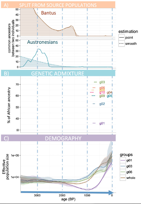 論文做惹非常多、非常詳盡的統計分析,主要發現是,島上南島祖源與最接近的亞洲族群(位於婆羅洲南部),分家年代大概是2000到3000年前,而班圖祖源與最接近的非洲族群(位於東南非),則是分開1500年左右。不過,以上估計只是遺傳上的分家,而不能代表移民島上的確切年代。
