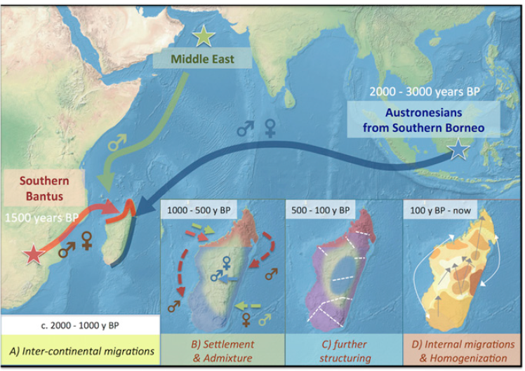 兩個來歷截然不同的族群(換個角度想,一個是非洲,另一個是出非洲),分別由一東一西,渡海抵達以後,接著在島上情慾交流。在混血時,南島貢獻的女男比例比較平均,班圖則以男生為主。經歷數百年的發展後,他們形成惹現在的馬拉加西人。