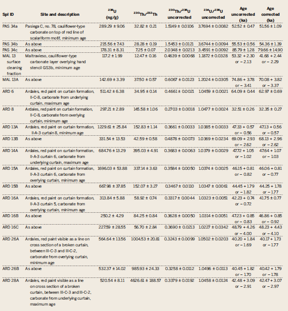 這個論文,採取以上辦法分析西班牙 3 處岩洞中,牆壁上顏料的年代;共有 53 個樣本,來自 25 個碳酸鹽層。其中 La Pasiega(Cantabria)屬於 Monte Castillo 岩石藝術系統,也是聯合國「世界遺產」一員;此遺址定年顯示,最早的一件樣本,距今至少 6.48 萬年。另一處 Maltravieso(Extremadura)的岩洞,最古早的樣本距今至少 6.67 萬年;而 Ardales(Andalucía)則是 6.55 萬年。
