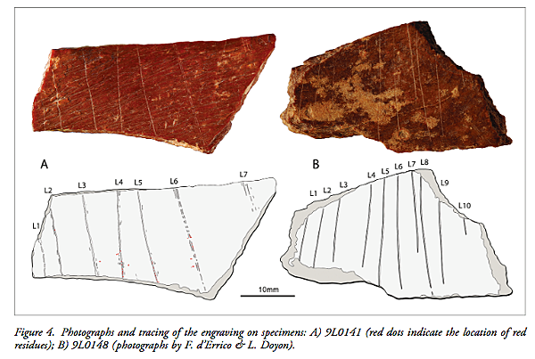 出土許昌人的地層中,2 件骨頭碎片上頭有刻痕。骨頭上的刻痕,可能是敲碎骨頭間接形成,或是把肉取下造成的痕跡;若是如此,不能算是有文青意識。和同一地層出土的其他骨頭比較,2 件骨頭 9L0141 和9L0148,造成痕跡的方式都和其他骨頭很不一樣,不是取肉時形成的痕跡,而是肉骨分離一段時間以後才新出現的刻痕。