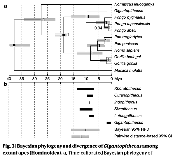 由序列差異估計,紅毛猩猩與巨猿的分家年代,介於距今 1000 到 1200 萬年前。這邊也要注意,這是由十分有限的遺傳資訊,估計得到的結果。