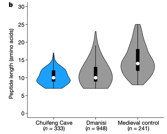今年幾個月前發表的論文,由高加索南部,喬治亞的 Dmanisi 遺址取得 177 萬年前犀牛牙齒的蛋白質。相比之下,這個論文的樣本 190 萬年前更早一點,不過都比古代DNA 更古早很多。