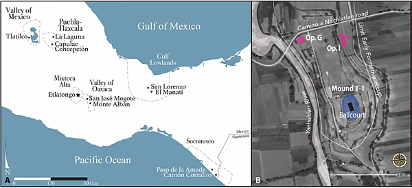這個論文報告在墨西哥的瓦哈卡,Etlatongo 遺址中出土的球場。球場共有 2 處,從殘留的形狀,考古學家判斷它們當年是一座標準球場,不過兩座球場設計形狀有點不一樣。