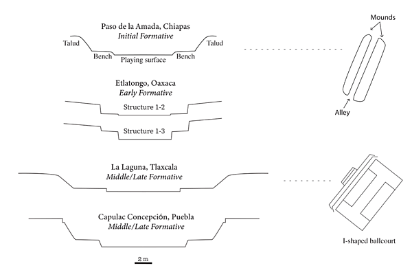 因此有人認為,球賽起源自中美洲的低地區,再傳播到其他地方。 不過幾乎沒有出土當時的球場,唯一案例是低地區的恰帕斯(Chiapas)的 Paso de la Amada 遺址,距今約 3650 年前。這是已知最早的大型標準球場。