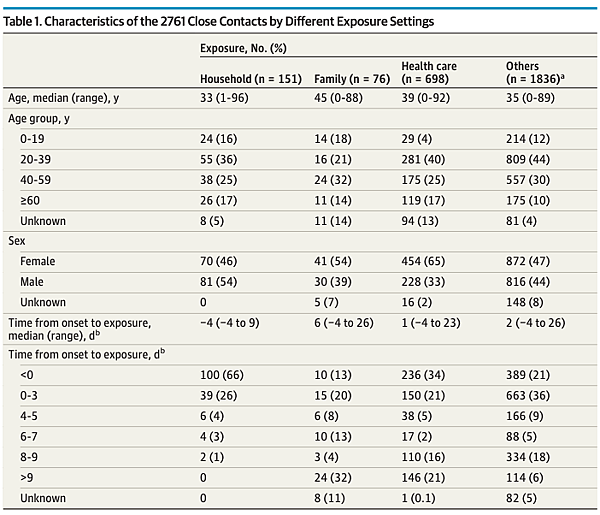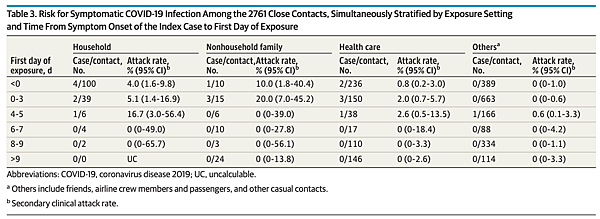 感染源仍處於潛伏期,尚未出現症狀之前,299 位接觸者有 0.7% 被傳染機率。傳染源症狀出現後之前 5 天,1818 位接觸者被傳染的機率為 1.0%。超過 6 天以後才接觸,852 人都沒有傳染記錄。