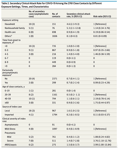 接觸者被傳染的機率合計是 0.7%,住在一起的傳染率比較高,達到 4.6%(同居人很危險!),沒住在一起的親戚也有 5.3%(親友也很危險!)。 一直沒有症狀的 9 位感染者,總共有 91 位接觸者,都沒有傳染記錄。