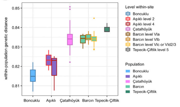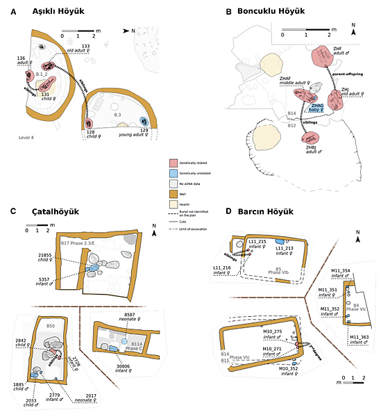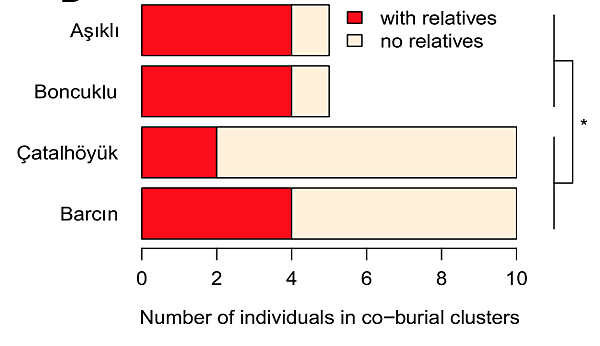 加泰土丘的 10 人中,只有 2 位近親。Barcın Höyük 則是 10 人中有 4 位。Tepecik-Çiftlik 的 5 人有 2 位。每個遺址都有近親埋在一塊,但是總比例不高。