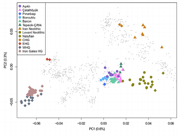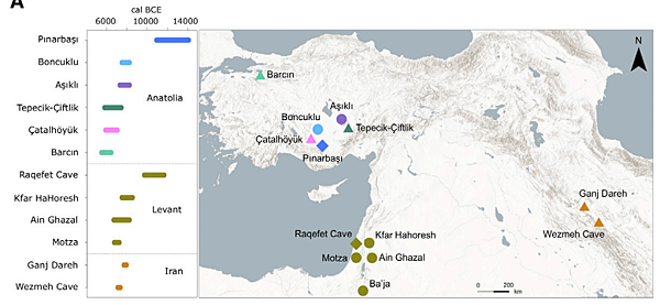 這個論文獲得 22 個新的古代基因組,加上之前發表過的樣本。5 處遺址主要可分為兩個時期。 比較早的是尚未使用陶器的時期(Aceramic),此時安納托利亞中部,首度有人定居: