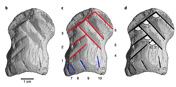 切割的痕跡大部份是 V形或 U形,但是鹿骨是 L形,而且刻痕的深度,是一般切肉的 10 到 50 倍深。另一方面,鹿的指骨,看起來也不像適合食用的部位。