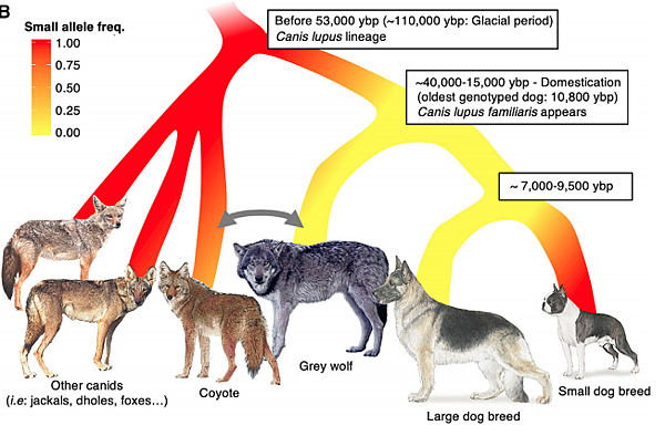 檢視現代、古代的狗與狼以及親戚們,論文判斷會造成大隻狗的 T 變異,是後來才衍生的版本,最早見於 5.3 萬年前,住在西伯利亞的古狼,因此它出現的年代比狗狗馴化更早。而對應小隻狗的 C 變異,則是此一基因原本的版本。
