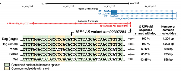 結構上,兩者的 mRNA 產物會結合在一起,而血液中胰島素的蛋白質含量有差;由此推論,IGF1-AS 基因上那個位置是 T 或 C,會影響胰島素的蛋白質多寡。對體型大小的影響,最多可達 15% 左右。