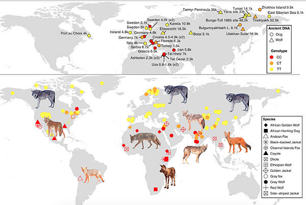 距今 2300 年配備 CC 的以色列古狗,14.6 公斤,確實為小隻狗。而 4000 年前的紐芬蘭大隻古狗,不意外配備 TT;距今 1.65 萬年的古狼為 39.6 公斤,算大隻狼。