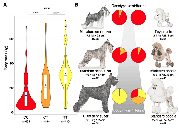 各式狗狗都是同一個物種,遺傳差異極為有限,但是體型差異非常大,可以大到如藏獒,也能小到如吉娃娃。這個 2022 年的論文偵測到一個遺傳變異,會影響狗的體型大小,而且追溯下去發現其誕生年代比狗的馴化更早,已經有些古早的狼配備。