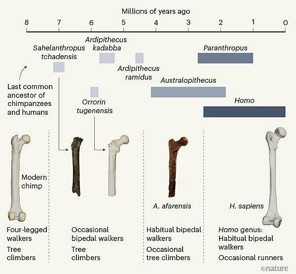 人類的祖先與黑猩猩分家以來,誕生過不少物種。已知年代最早的查德猿人距今 700 萬年左右。 這個 2022 年的論文報告,股骨分析指出查德猿人似乎已經會直立行走,表示雙足直立,或許是人與黑猩猩分家不久後便存在的特徵。