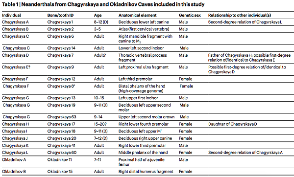 由遺傳看來 17 件樣本是 6 女、11 男。Chagyrskaya 取得的資訊較多,分析主要在這兒。有趣的是比較發現,有些不同樣本其實原本是同一個人。