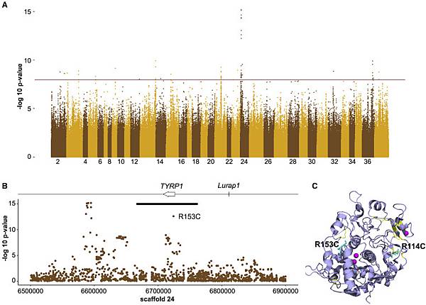 也就是說美洲黑熊是 R153C,棕熊是 R114C。兩處突變都會影響 TYRP1 蛋白質的作用,降低真黑素的量。 棕熊版 R114C 變淡的效果較為明顯,不過並非所有棕熊都配備,由此想來,棕熊變淡還有其他的遺傳因素。