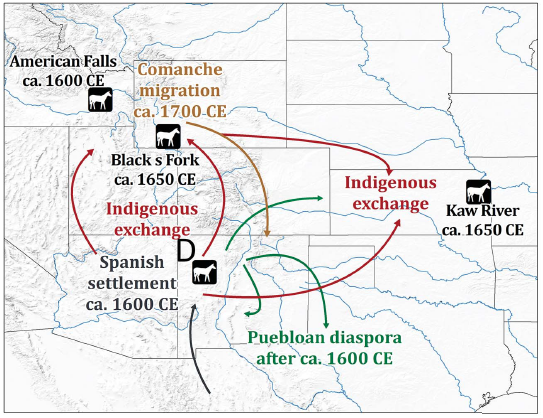 然而這回研究指出,至少有四處地點的馬骨年代比 1680 年更早,包括懷俄明州的 Blacks Fork、堪薩斯州的 Kaw River、新墨西哥州的 Paa’ko、愛達荷州的 American Falls Reservoir。這表示歐洲殖民者受挫以前,馬已經進入印地安人的世界,傳播到更遠的地點。