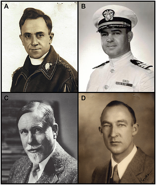 海龜湯的幾位相關人猿。(A) 據說將食材從北極帶回的極區探險家 Father Bernard Rosecrans Hubbard。(B) 極區探險家 George Francis Kosco。(C) 晚宴主辦人 Wendell Phillips Dodge。(D) 保存樣本的 Paul Griswold Howes。圖/取自 參考資料3