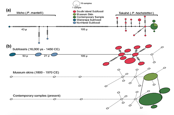 這個論文認為那是由於古代DNA 片段,常見 CT 轉換導致的誤判。這回由完整粒線體估計,兩者在數百萬年前,有最近的共同祖先,應該就是同一次抵達紐西蘭。