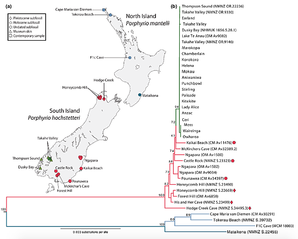 紐西蘭的「南秧雞」是一款不會飛的鳥類,身高約 50 公分。一百多年前以為滅團,公元 1948 年又尋獲殘存成員,目前有個復育中的迷你族群。 南秧雞還有個近親物種「moho」真的已經滅團。這個 2023 年的論文,從死鳥骨頭、博物館皮膚樣本、活鳥取得粒線體 DNA,探討遺傳歷史。