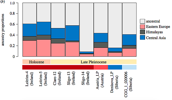 愛爾蘭、奧地利、西伯利亞南部的丹丹洞(就是丹尼索瓦人那個地點)超過一萬年前的樣本,遺傳都更接近喜馬拉雅的棕熊。 愛爾蘭未滿一萬年的棕熊,則更接近歐洲東部的同類。反正歐洲棕熊的前後輩,遺傳不太一樣。