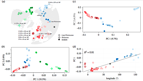 這個論文新取得 2 個古代基因組,一個位於日本,距今 3.2 萬年,另一個西伯利亞東部,超過碳同位素定年的上限 5 萬年。 再加上以前發表的樣本,總共有 7 個來自曾經有,現在已經沒有棕熊的地點。愛爾蘭 5 個、日本的本州 1 個、加拿大的魁北克 1 個。