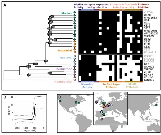 新獲得的福賽斯坦納菌以外,之前也發表過幾個古代樣本,包括一位尼安德塔人。 一起比對發現,工業化以前,這款細菌遺傳上分歧很多;現今世界各國的福賽斯坦納菌,卻都能追溯到相對近期才脫穎而出的演化分支。