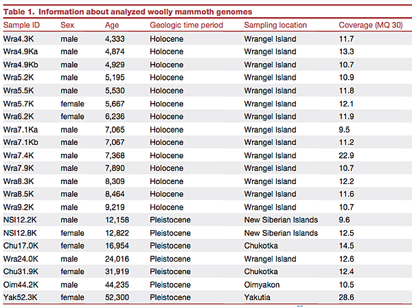 如今 Wrangel 島位於北冰洋,這個論文取得此島 13 個猛獁象古代基因組,加上之前發表的 8 個樣本,探討孤立於海島的猛獁象,和更早以前的族群有哪些差異。 它們的平均覆蓋率,最低也有 9.5,可以進行比較細微的分析。