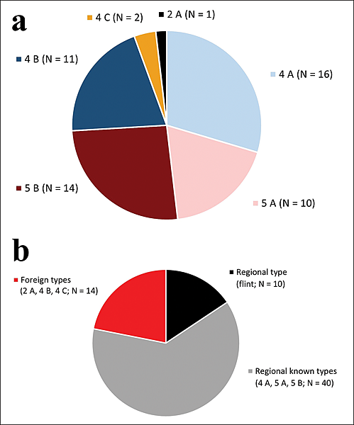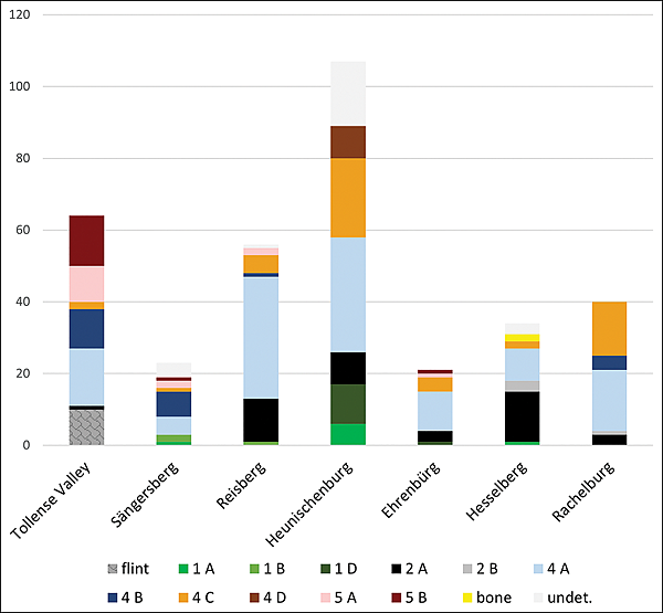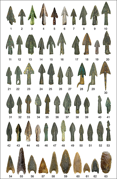 圖蘭森河出土的款式,包括 2A、4A、4B1、4B2、4C、5A、5B。圖蘭森河的位置偏歐洲北部,簡單說,在歐洲北部 4A、5A、5B(共 40 件)比較常見,2A、4B、4C(共 14 件)幾乎沒有。至於燧石箭頭,應該是當地的產物。