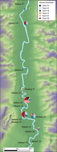 目前戰場出土的箭頭總共有 10 件燧石,54 件青銅;更上游與下游,還有 14 件燧石及 8 件青銅箭頭。 青銅時代晚期的歐洲,各地出土的青銅箭頭總數不少,圖蘭森河出土 54 件,是單一地點數量最多的,多數介於 2 到 4 公克。