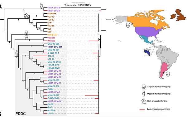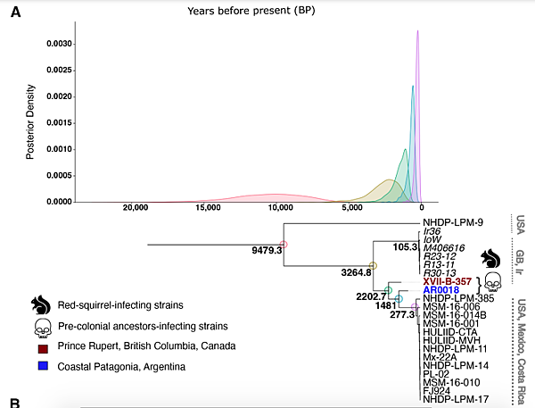 其次分家的還是現代樣本,卻出現在出乎意料的地區......以及感染者。那就是英國的松鼠。不但不在美洲,甚至也不是人類!