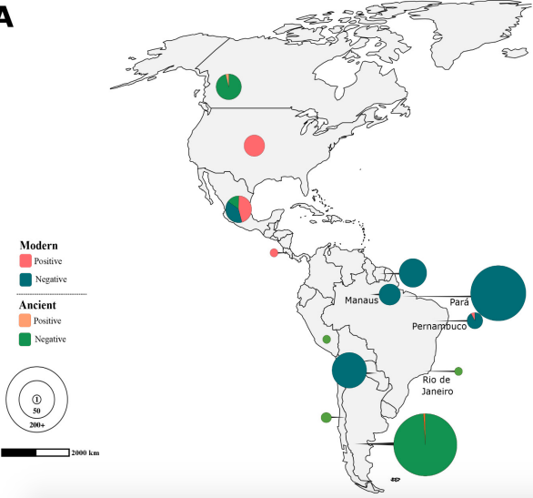古代樣本方面,這個論文沒有全新實驗,而是由資料庫搜尋。歐洲殖民以前的 389 位古代美洲居民,有 3 位的樣本抓到美洲麻風的 DNA 片段,而且都沒有偵測到麻風,排除共同感染。