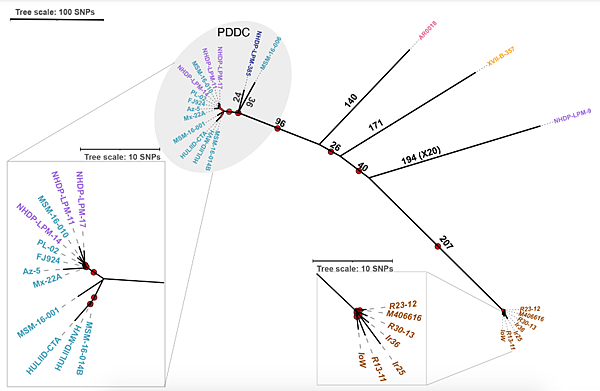 彼此最親近的一大群現代樣本,被統稱為 PDDC,全名為 Present-Day Dominant phylogenetic Clade。它們大部份位於現今的北美洲,遺傳上和阿根廷的古代同類最近,不過取樣殘缺下,並不能直接判定這群細菌源自南美洲。