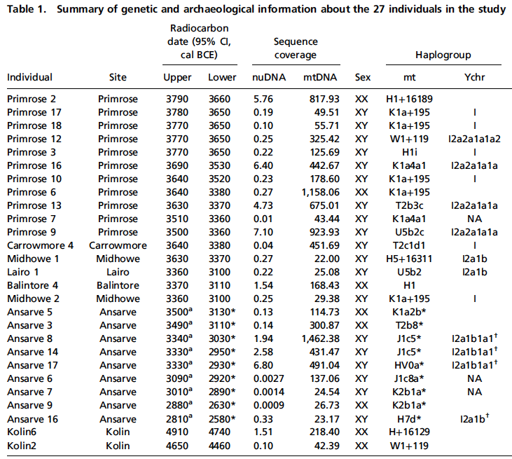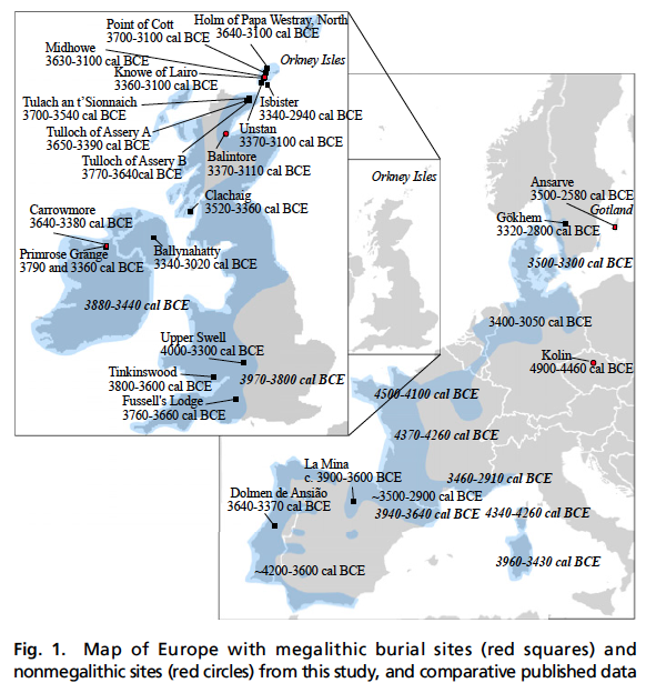 巨石文化的起源與傳播,目前仍不清楚。只知道 6500 年前法國、5700 年前不列顛、5600 年前斯堪地那維亞,都出現惹巨石結構。這個論文由距今 4600 到 5800 年前,不列顛的愛爾蘭、奧克尼、波羅地海的哥得蘭島,一共 5 個巨石文化墓葬遺址,獲得 24 個樣本,探討巨石文化人的社會關係。